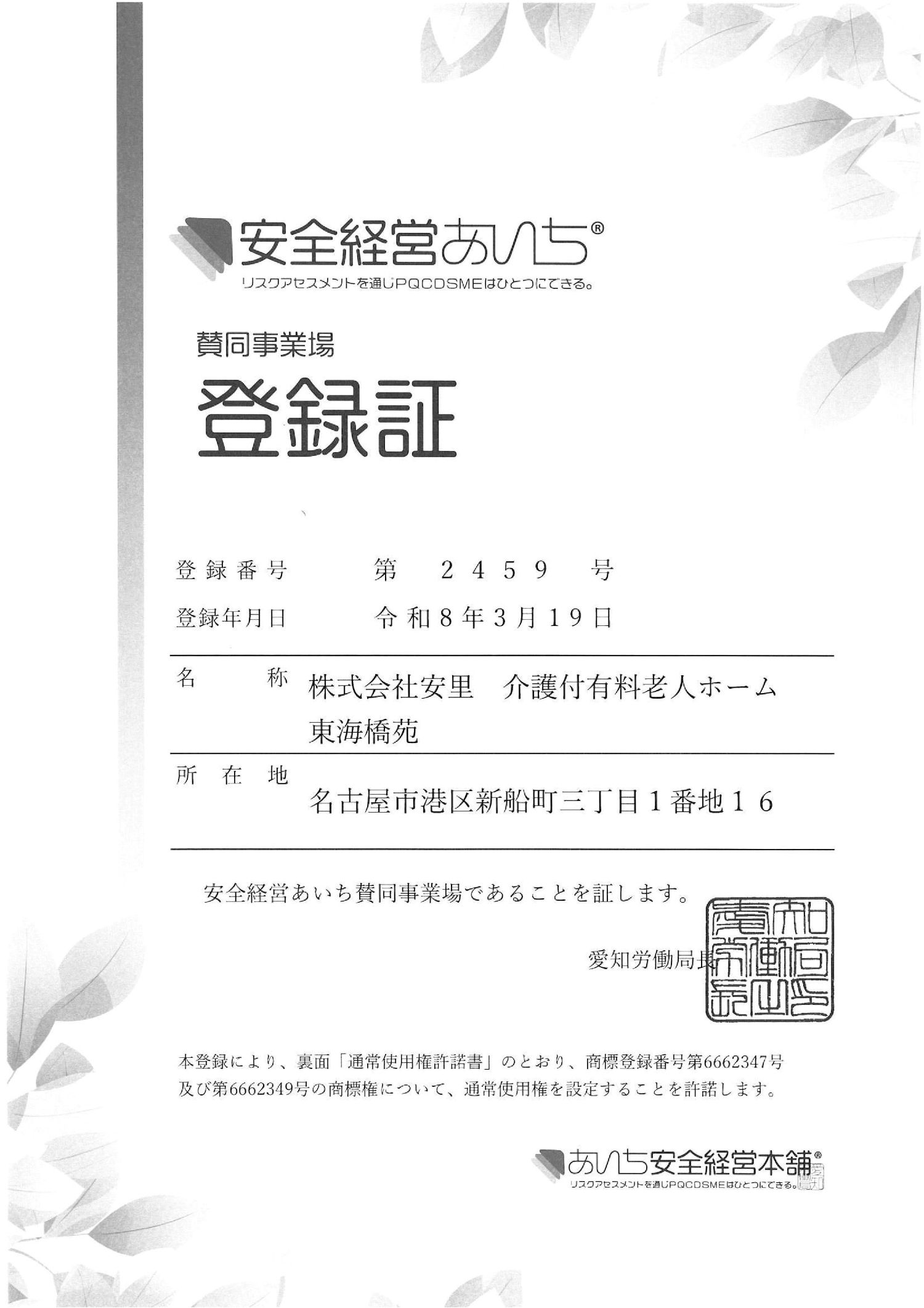 このたび当社は、「安全経営あいち賛同事業制度」に賛同し申請を行い、愛知労働局より登録証を交付いただきました。